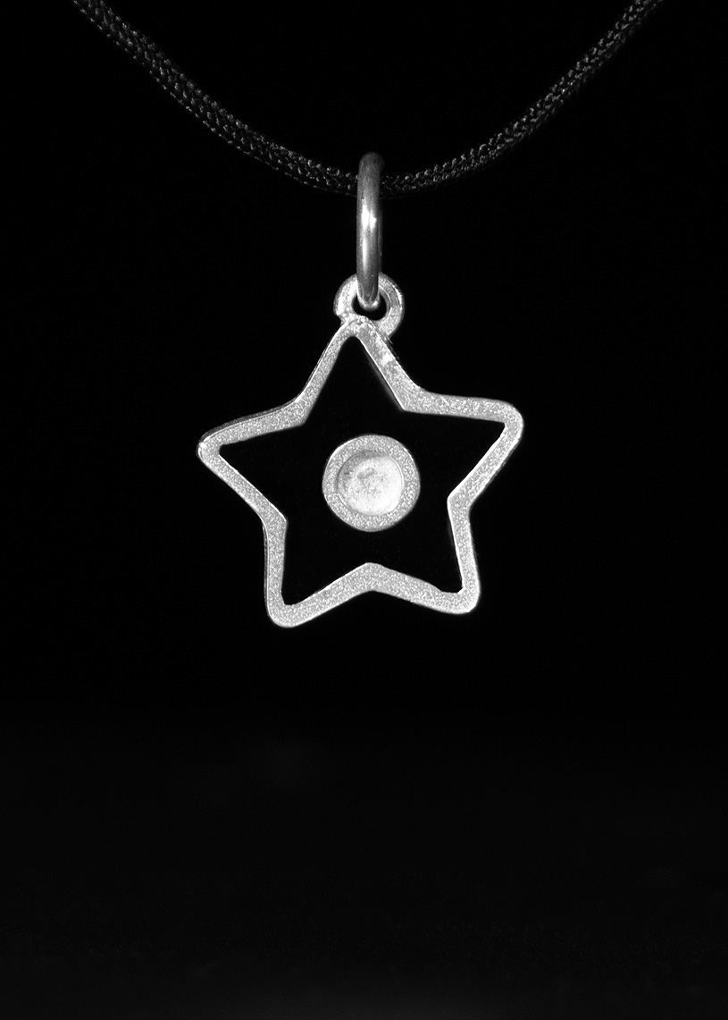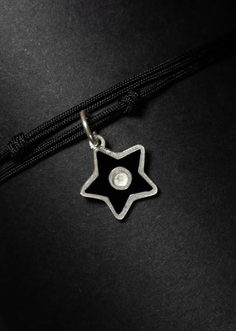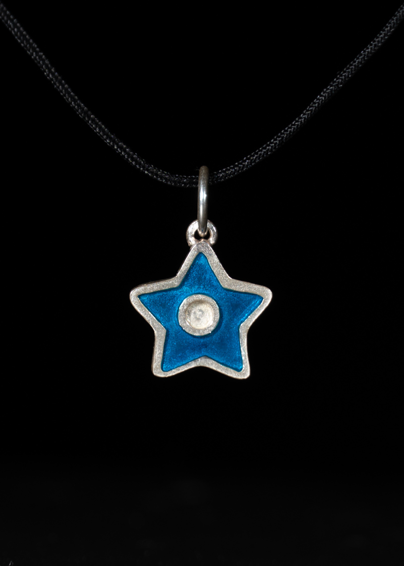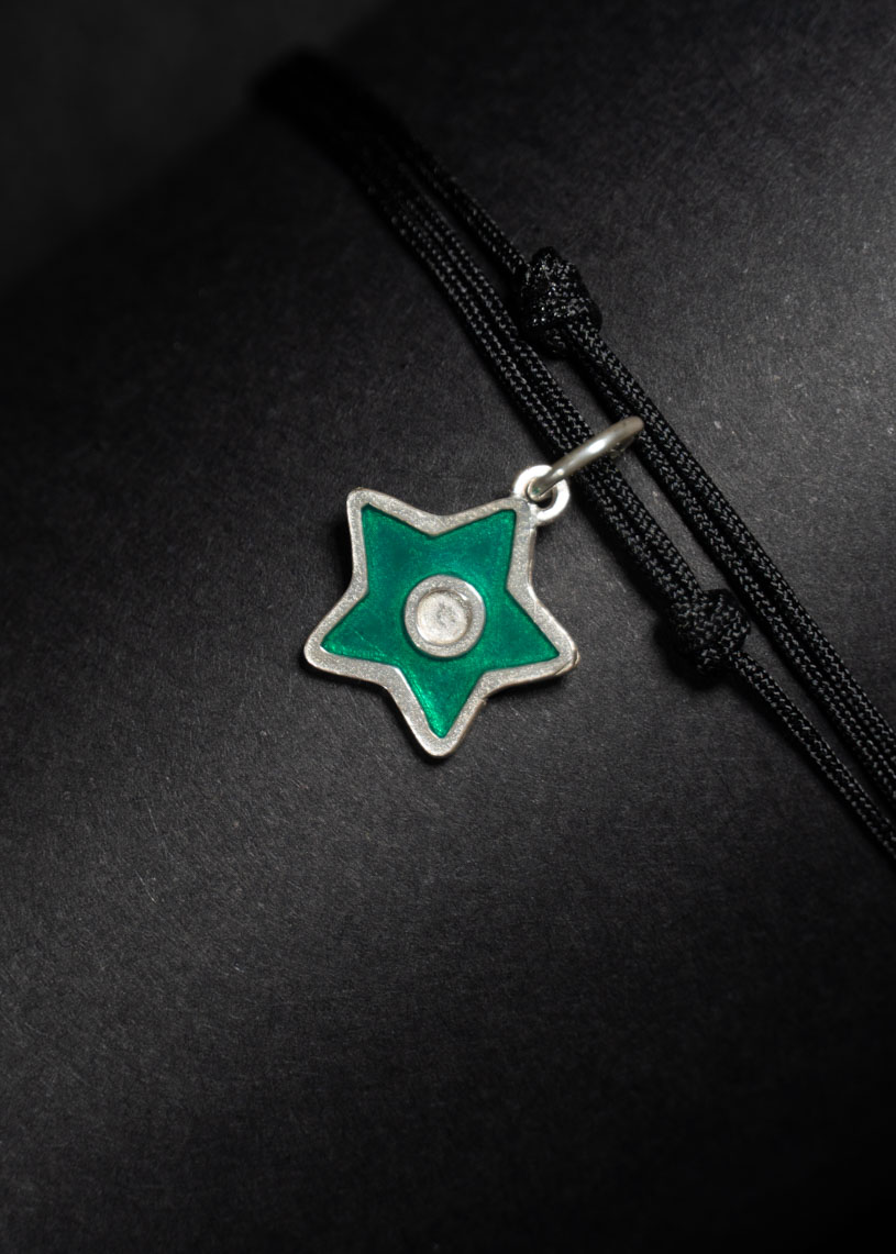 La estrella de 14 mm de diámetro, confeccionada en Plata de ley 925 con esmalte de color, destaca como el elemento principal de este colgante hecho a mano. El conjunto incluye un cordón de hilo encerado con dos nudos corredizos que permiten ajustar fácilmente su longitud, además de un broche de plata que aporta seguridad y un acabado cuidado. Ligera, resistente al agua y creado artesanalmente en Menorca, este colgante es una joya que conecta tradición y estilo actual.