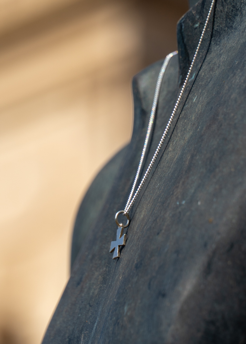 La cruz, de 10 mm de alto y 10 mm de ancho, está realizada en Plata de Ley 925 y destaca por su diseño sencillo y lleno de significado. Acompañada de una cadena de plata disponible en tres longitudes, 40 cm, 45 cm o 50 cm, se adapta cómodamente a tu estilo. El cierre de plata garantiza un ajuste seguro y un acabado cuidado. Hecho a mano en Menorca y resistente al agua, este colgante es una joya pensada para acompañarte cada día.