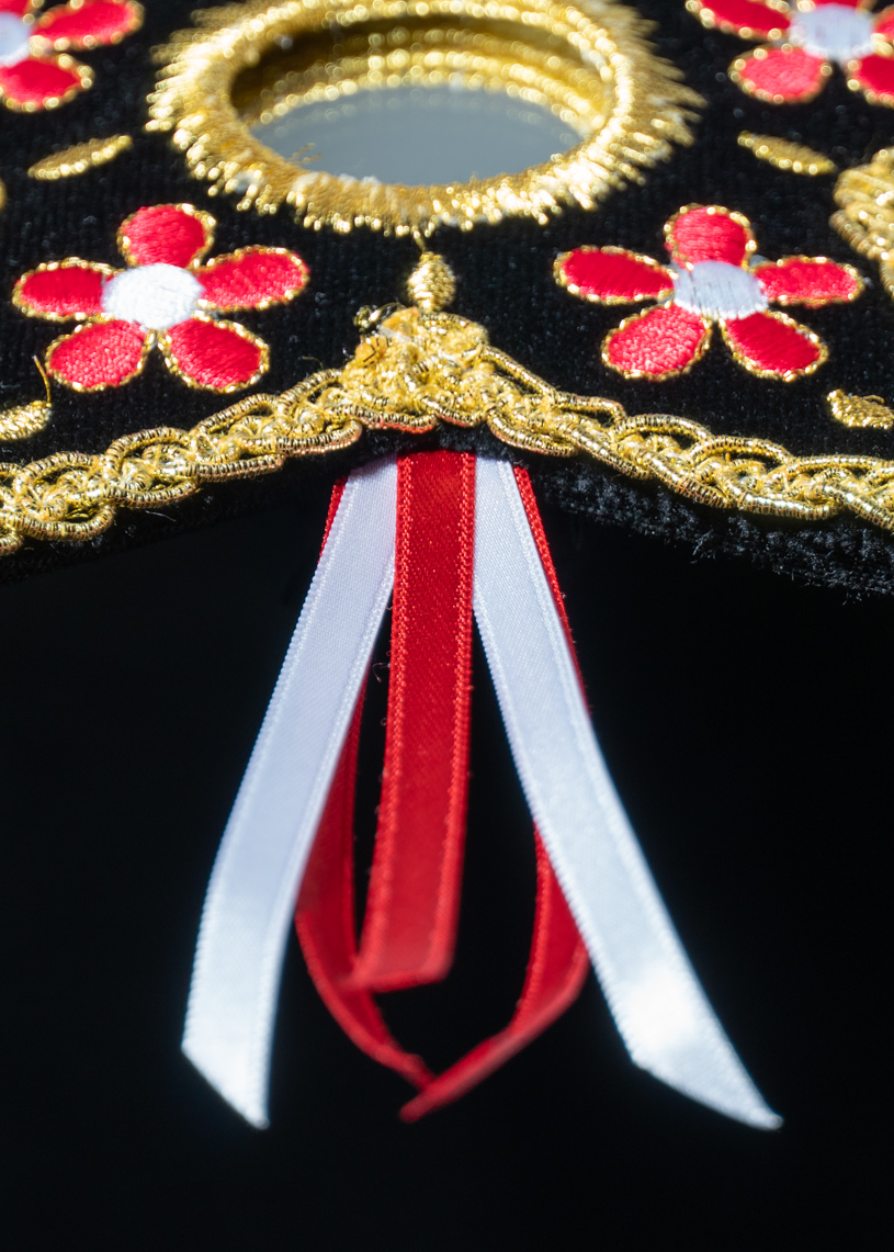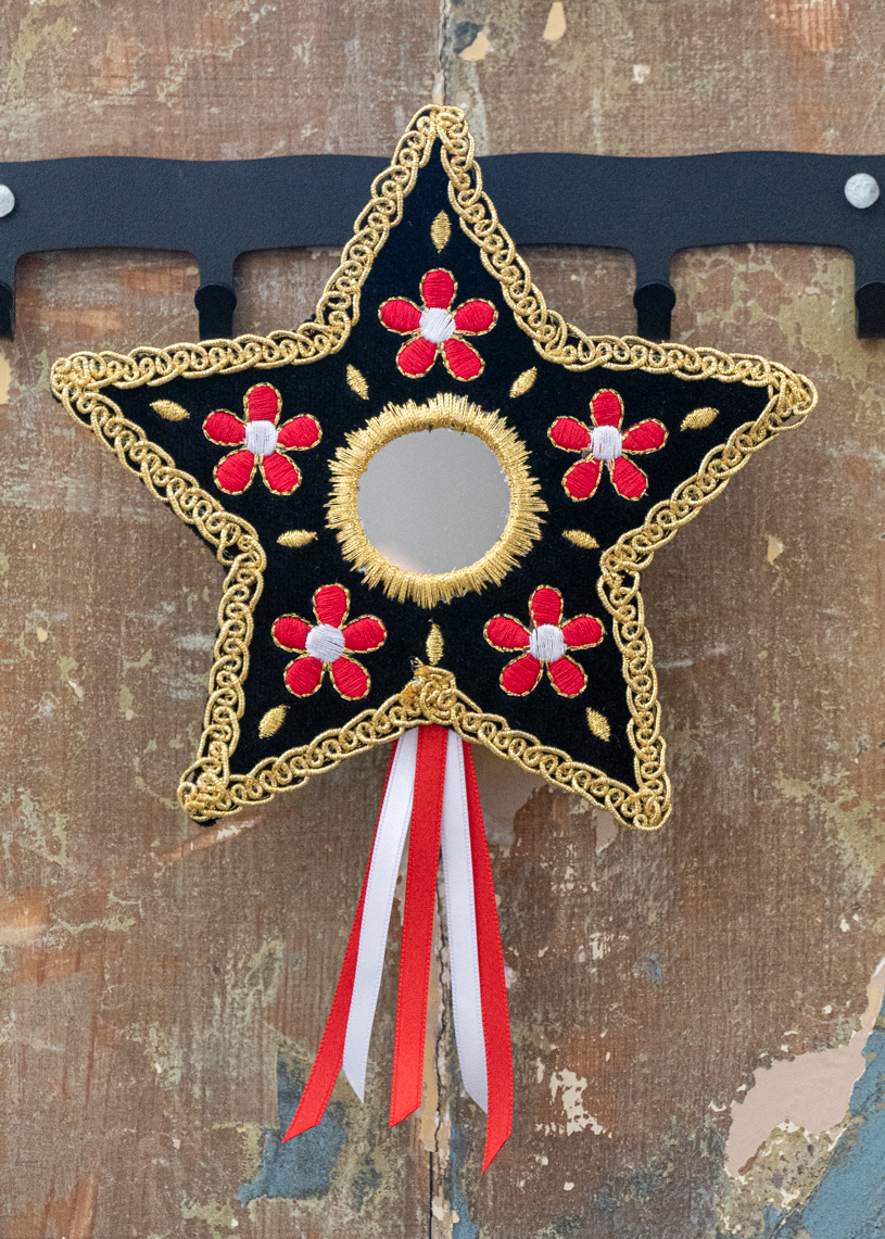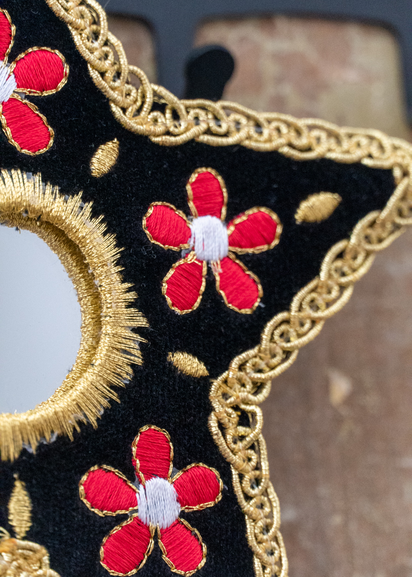 Confeccionado a mano, el Estel dorado con flores rojas tiene forma de estrella de cinco puntas y está elaborado sobre una base de terciopelo negro, con un espejo circular en el centro. Su contorno está realzado con un galón dorado que enmarca y resalta su silueta con elegancia, y un bordado dorado recubre y protege al espejo.