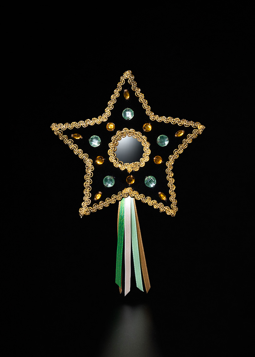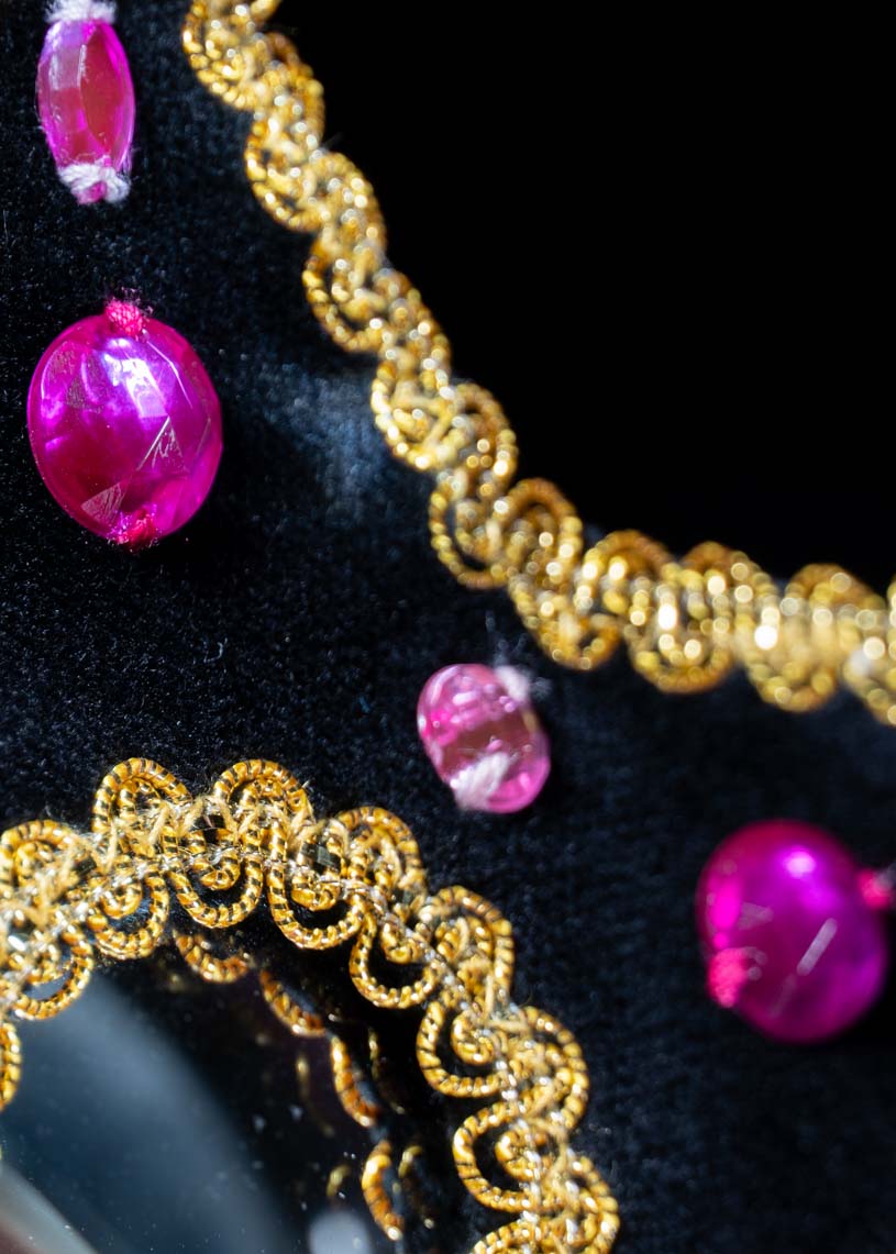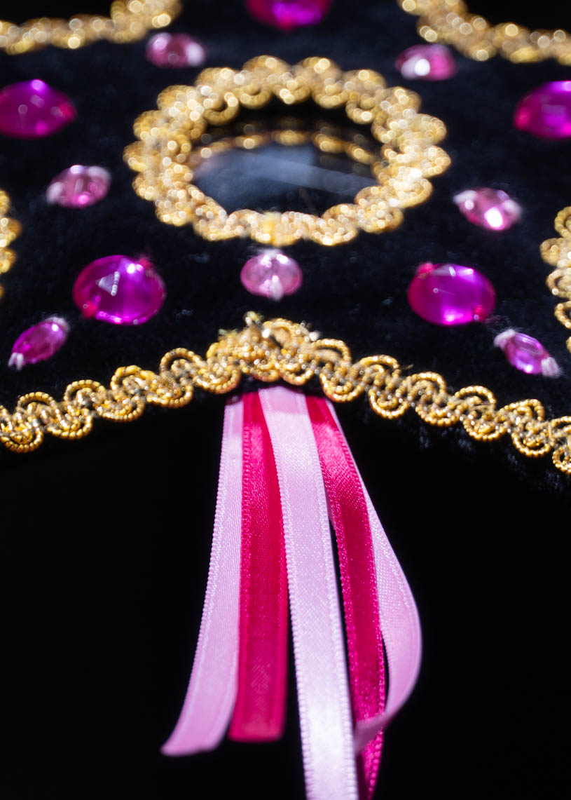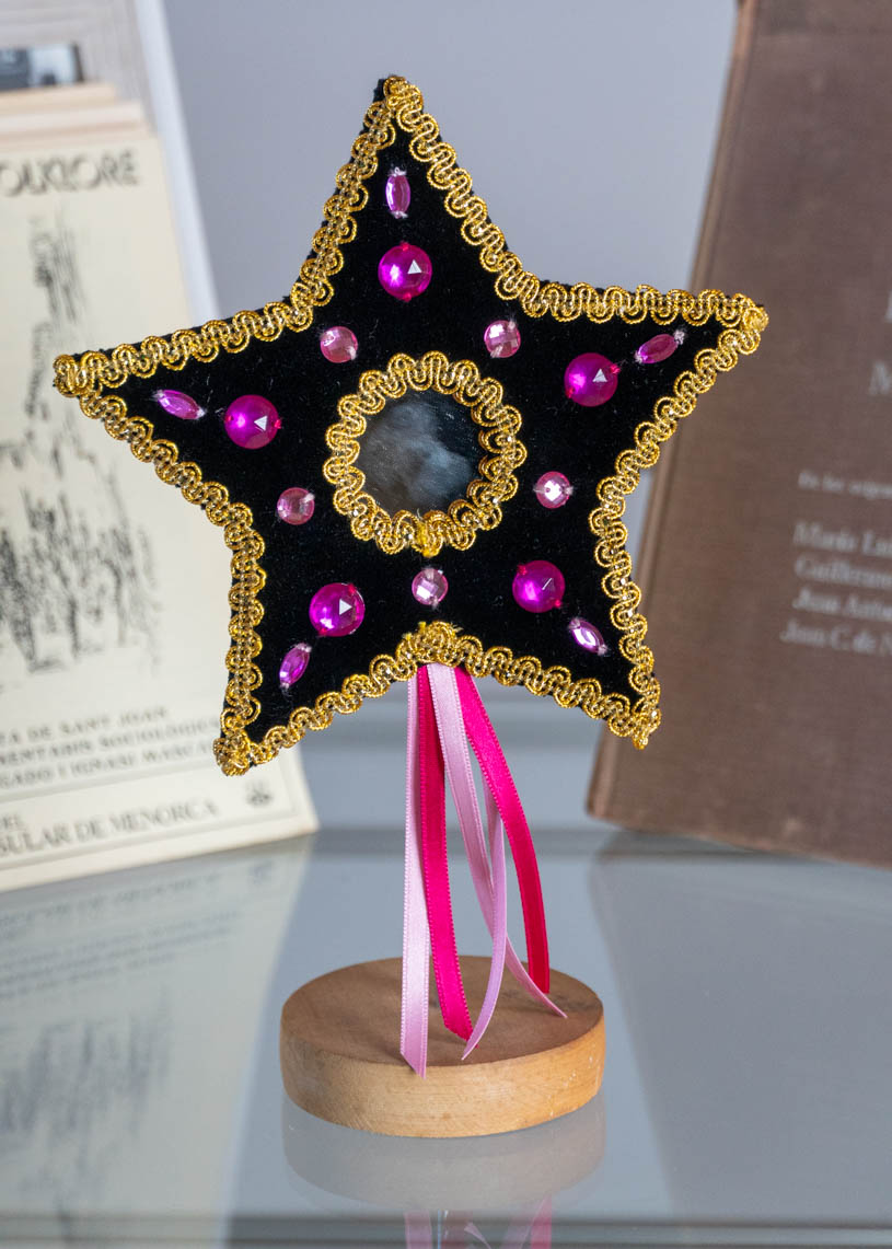 El Estel dorado con piedras rosas es una pieza realizada a mano en forma de estrella de cinco puntas está elaborada sobre terciopelo negro y decorada con galón dorado que perfila su silueta y realza su diseño. En el centro, un pequeño espejo circular, también rematado con galón dorado, está rodeado de pedrería en tonos rosa y fucsia que aportan brillo y contraste.