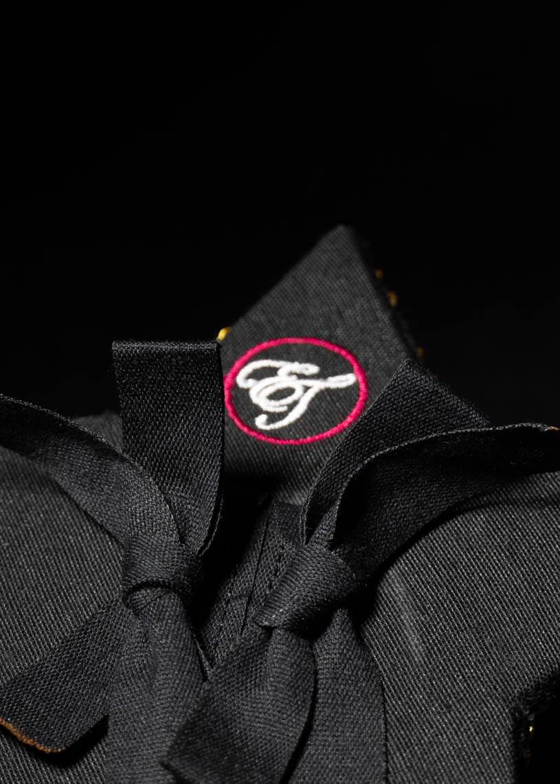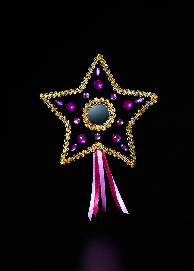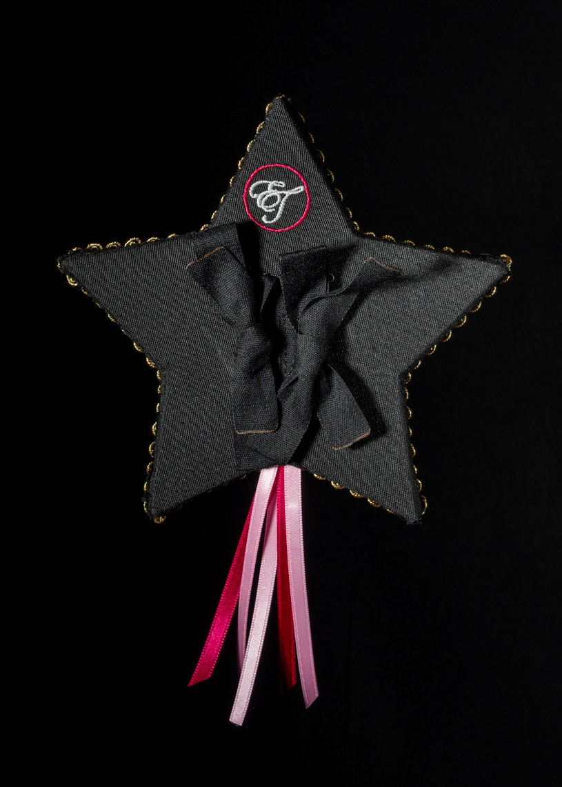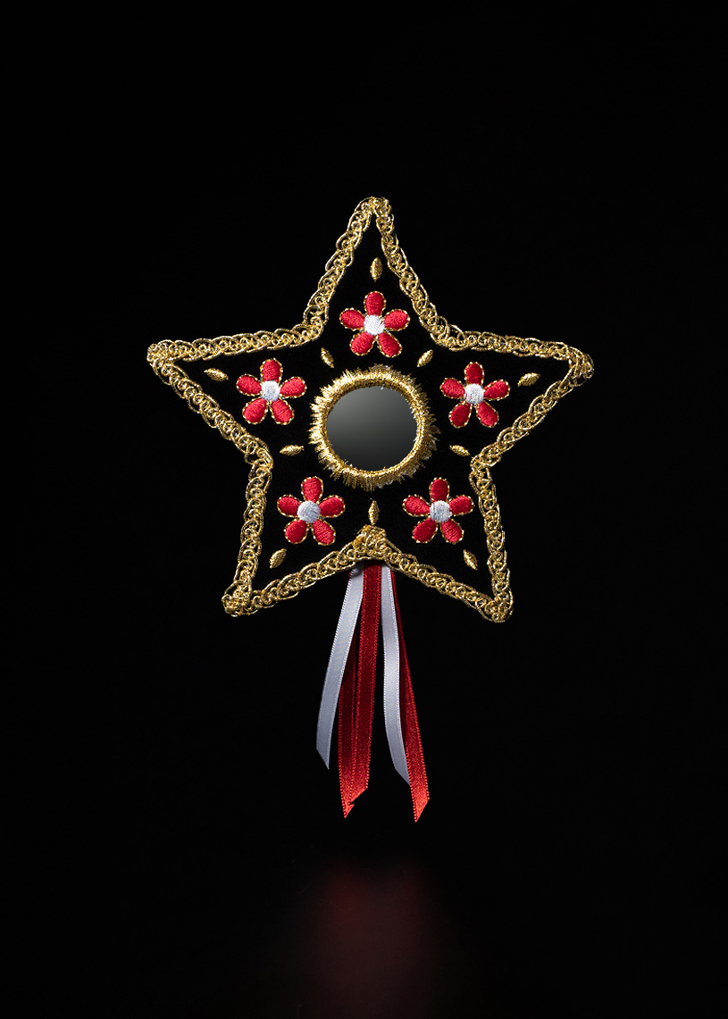 El Estel dorado con piedras rosas es una pieza realizada a mano en forma de estrella de cinco puntas está elaborada sobre terciopelo negro y decorada con galón dorado que perfila su silueta y realza su diseño. En el centro, un pequeño espejo circular, también rematado con galón dorado, está rodeado de pedrería en tonos rosa y fucsia que aportan brillo y contraste.
