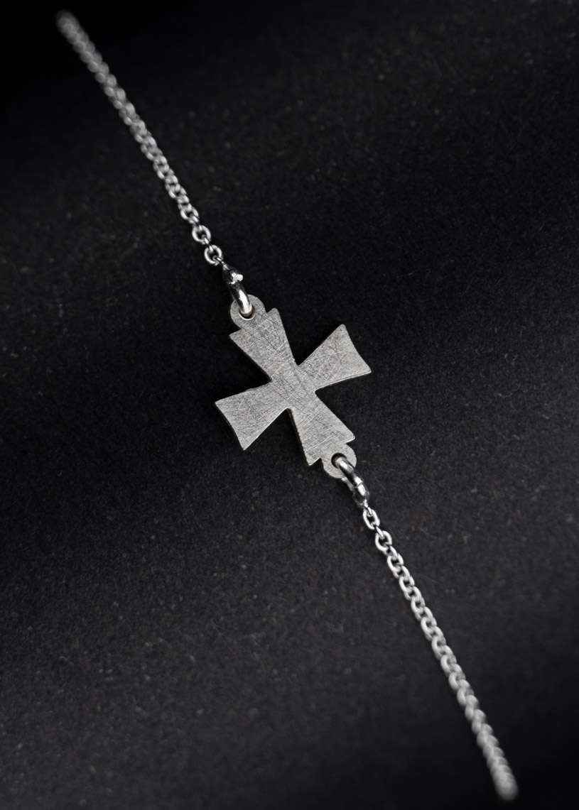 Inspirada en la emblemática cruz de la bandera de las fiestas de Sant Joan de Ciutadella, esta pulsera está elaborada artesanalmente en su totalidad en Plata de ley 925 e incorpora una cruz de 1 cm x 1 cm. Su diseño minimalista incluye una cadena de plata ajustable de 14 cm aproximadamente con alargador de 5 cm y un cierre de plata, ofreciendo un perímetro máximo de 19 cm y permitiendo ajustar fácilmente la pulsera a la muñeca.
